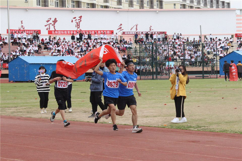 万米运动员庞可心和秦田高举学院旗帜,共同跨过终点