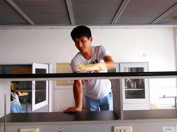 8月26日,化学与药学院制药1404班班长刘帅君带领全班31名同学参加义务打扫化学楼实验室活动。