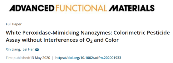 近日,青岛农业大学化学与药学院韩磊教授课题组在纳米酶生物传感领域取得重要进展,研究成果“White Peroxidase-Mimicking Nanozymes: Colorimetric Pesticide Assay without Interferences of O2 and Color”在化学与材料领域权威学术期刊《先进功能材料》(Advanced Functional Materials,IF=15.621,SCI一区)在线发表(DOI: 10.1002/adfm.202001933)。论文第一作者为青岛农业大学硕士研究生梁欣,韩磊教授为唯一通讯作者。