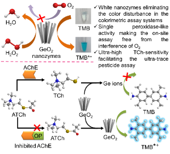要点1. 水热法合成的白色GeO2纳米酶,具有单一的仿过氧化物酶活性,在基于纳米酶的比色分析中可免受O2和纳米酶颜色的干扰。