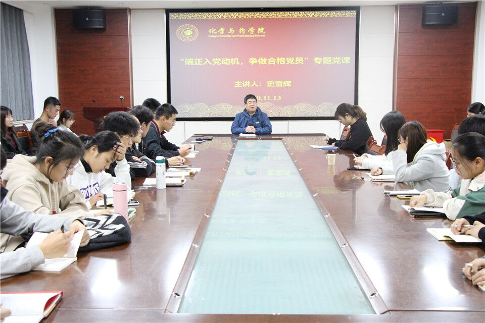 11月13日,青岛农业大学化学与药学院于学院会议室开展“端正入党动机,争做合格党员”主题党课,学院党委副书记史雪辉主讲,学院2020年下半年拟发展对象和第27期入党积极分子参加学习。