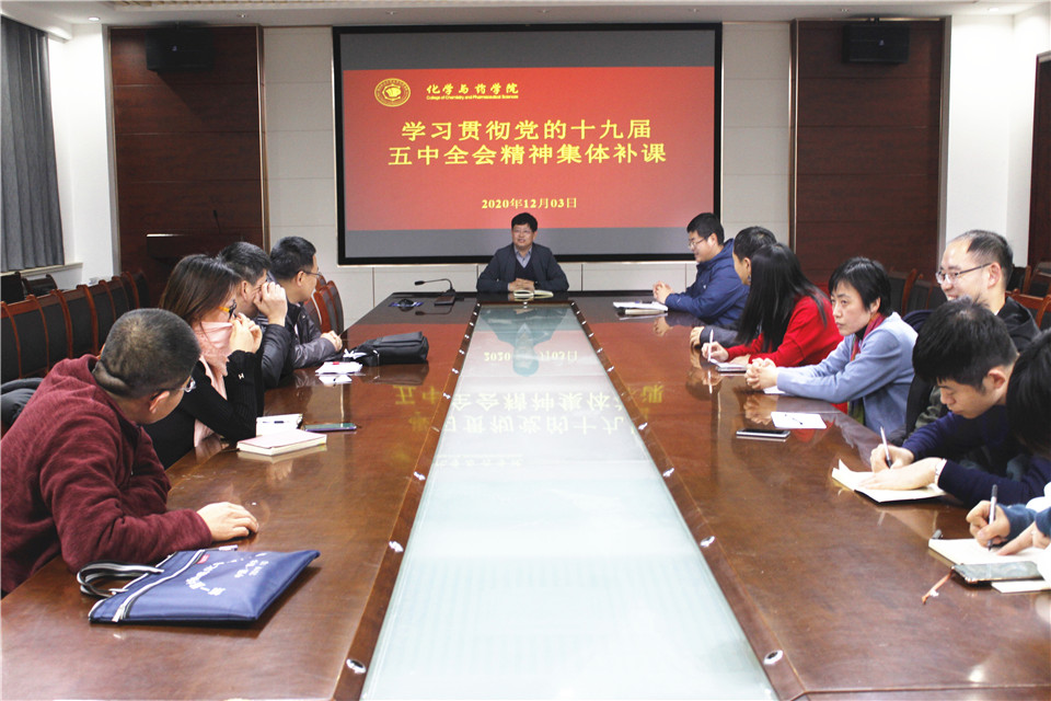 12月3日,青岛农业大学化学与药学院在化学楼会议室组织“学习贯彻党的十届五中全会”集体补课,学院党委书记王进国主讲,党委副书记、副院长史雪辉出席,因请假未能及时参加主题学习的教职工参加。