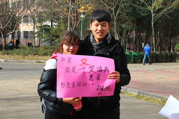 “假如我是艾滋病和患者,你愿意给我一个拥抱吗?”“你了解艾滋病吗,你知道如何预防和控制吗?”来往的同学面对卡片纸上问题,或沉思,或点头。