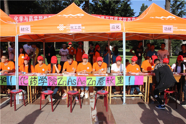 “团结、实干、积极、创新!”8月27—8月28日,化学与药学院新生报道处的学生工作人员胸前都佩戴有一枚闪闪发光的学生会会徽。