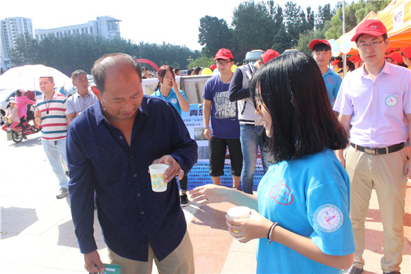 “流动的会徽”为新生家长送去炎热里的一杯清凉。