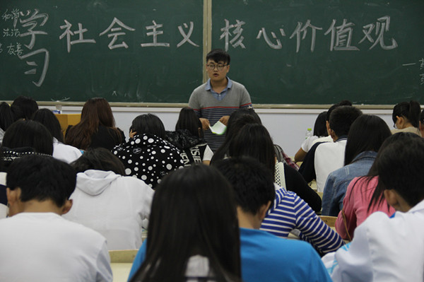 9月28日,在化学与药学院团委老师的统一部署下,各班级团支部开展关于“学习社会主义核心价值观”的主题教育活动,深入探讨价值观的丰富内涵。团课中邀请各班班助、党团工作部部长邵晓燕、学生党员、心理发展部干事出席此次团课。