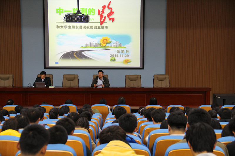 张凯钟分别从“创业的路”、“什么是创业”以及“对大学生的建议”三个方面开始了本次的交流讲座。他以中一监测的九年奋斗历程向同学们讲述了自己如何带领自己的团队白手起家,从一间60平米的网店放发展成为中国室内环境监测行业中的领军企业的故事。通过创业的艰辛之路,他告诫同学们要在大学期间不断充实自己,多方面的学习,而不要局限在自己的专业知识上。“凡所际遇,绝非偶然。只有那些不愿承认失败的人,才总愿意说‘无所谓’。”张凯钟这样跟同学们说道。关于创业的定义,他则从创业者应具备的素质和创业的条件两方面向同学们剖析了创业的外在条件和内在准备。“创业需要深耕细作,厚积薄发,要把眼光放长远,切忌只顾眼前利益。”面对大学生对创业的迷茫不确定,张凯钟告诫大家道。对于大学生创业,张凯钟给出了自己的建议。他告诉同学们创业是一种生活方式,只有拥有了阅历和经历才会有经验之说,因此他建议同学们毕业之后先去大企业就业积累经验,学习企业的管理机制,为以后的创业之路打好基础。