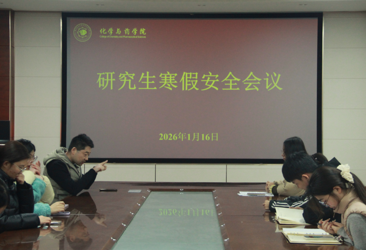 为做好研究生寒假期间各项工作,切实保障学生人身财产安全,1月16日,化学与药学院于化学楼会议室召开研究生寒假安全会议。会议由李帅帅教授主持,辅导员辛鑫、学院全体研究生参加。