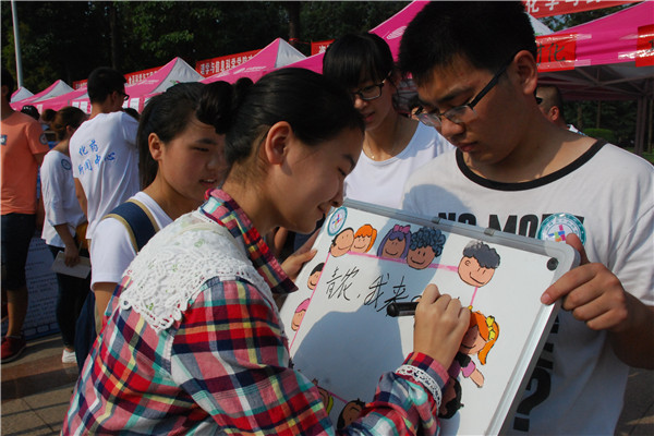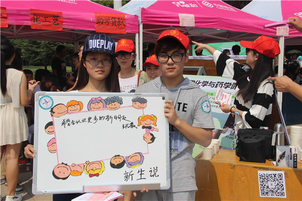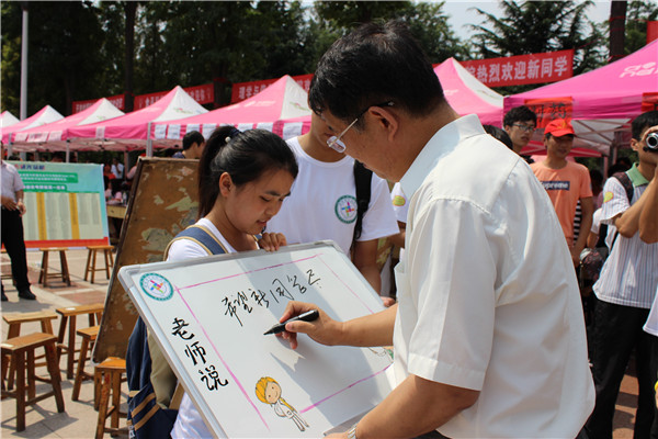 “8月29日,迎新第一天,化学与药学院推出憧憬大学,寄语新生之“新生说”、“老师说”活动。校党委书记李宝笃莅临化药新生接待现场并在“老师说”题板上填写新生寄语。