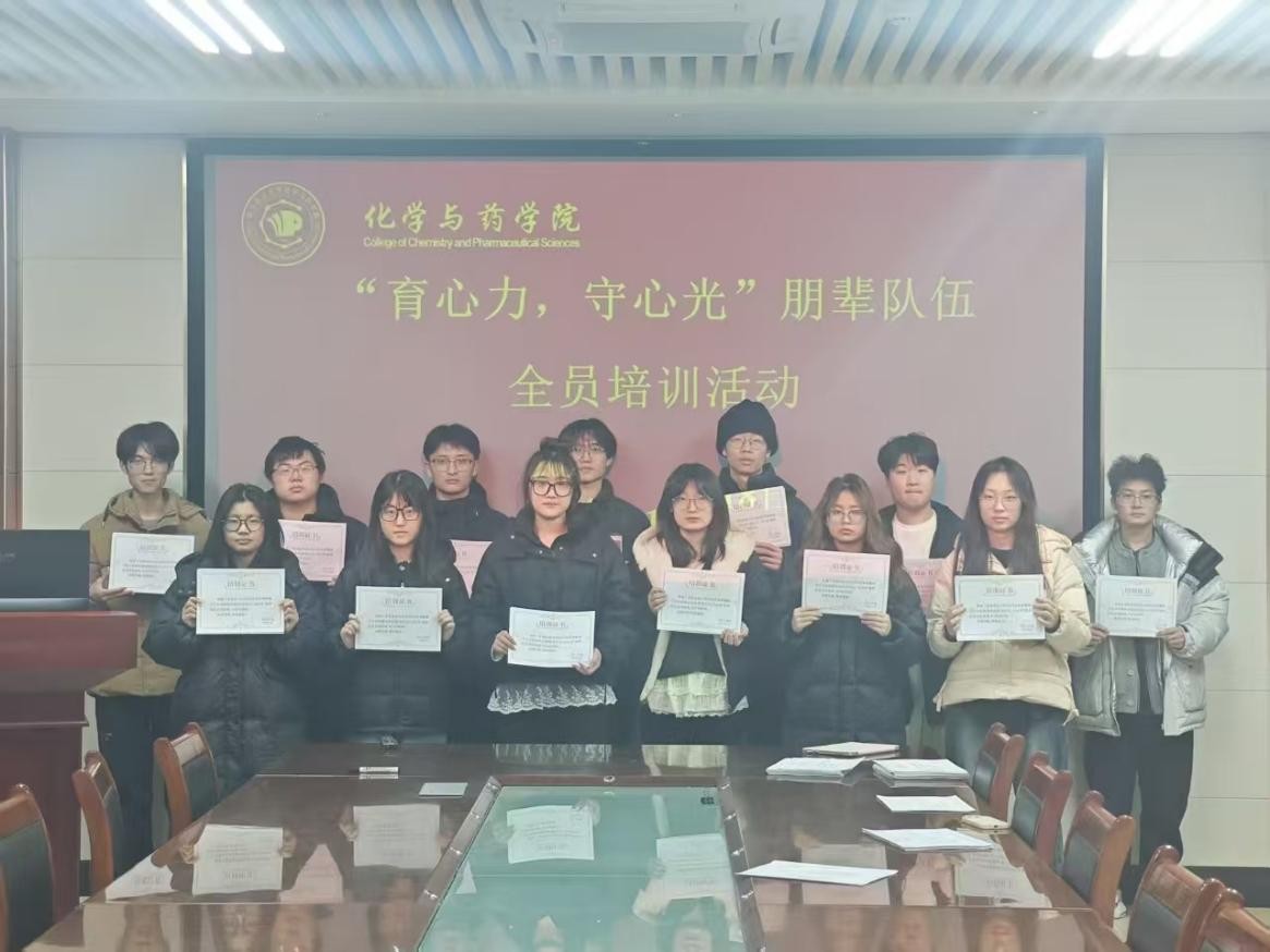 为完善朋辈心理互助体系,提升学生骨干心理助人素养,营造关爱身心健康的校园文化氛围,12月18日,化学与药学院于化学楼207举行“育心力,守心光”朋辈队伍全员培训合格证书颁发仪式,标志着为期一个月的专题培训活动圆满结束。