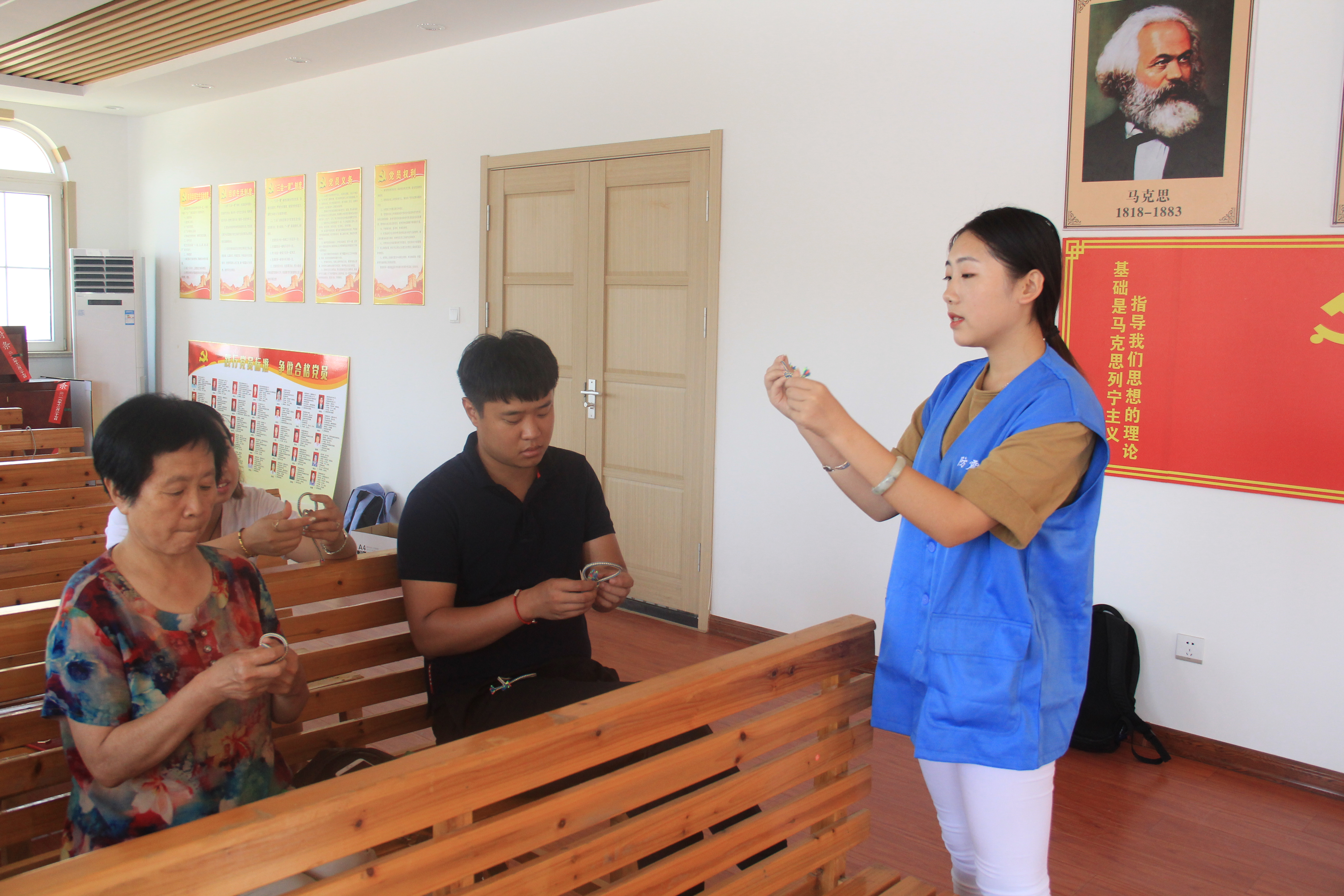 宣讲中,张成帝与队员田百芳在居民面前真实演示当有人受伤昏迷时,如何在第一时间采取救护措施—胸外按压法,并组织居民学习规范的胸外按压姿势。此外队员金梦娇将社区居民分为两人一组,向每一小组分发纱布,并教给他们身体受伤时应采取的正确包扎方法。她还选择了简洁有实效的结绳训练为内容向社区居民传授简单的自救方法,她与社区居民密切交谈,分享结绳经验,与社区居民融洽的相处在一起。