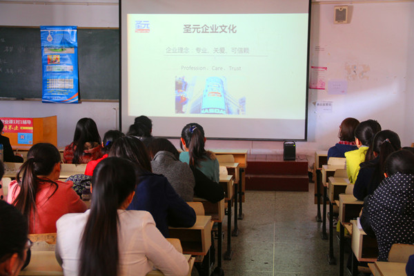 (图为圣元营养食品有限公司为同学们播放企业简介视频)