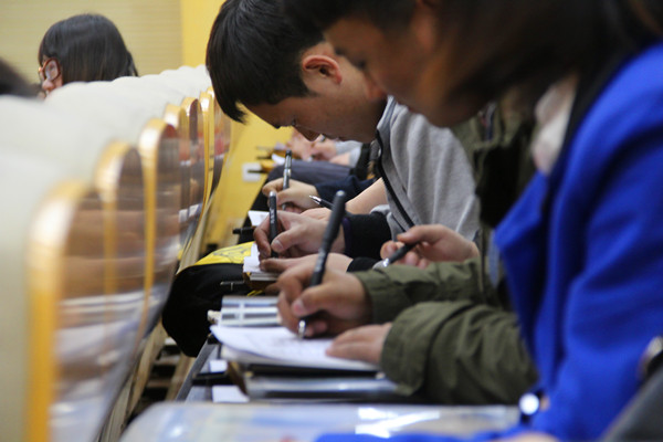 瀚生在宣传会期间,让对公司有兴趣的同学填写了应聘登记表,图为到场同学积极填写登记表场景。