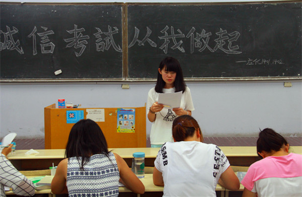 应用化学1402班团支书赵瑞利在活动中说:“期末考试是对大家本学期学习劳动成果的一次重大检阅,考试期间一味追求高分而忽略道德,是对自己不自信、也是不负责任的表现。”随后,她又根据往年考试期间发生的实际情况,向在座的同学们讲解了考试违规违纪的严重后果,并宣读《青岛农业大学考试违纪及作弊行为的处理办法》,以此来告诫同学们要诚信考试,从自身做起。