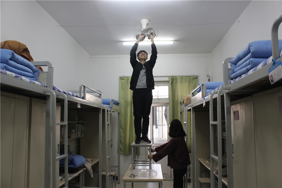 进入各个宿舍后,清理人员站到高处用螺丝刀把风扇拆开,将外壳拿下来用清水清洗并仔细擦拭扇叶,随后认真的将外壳安装好,落满灰尘的风扇焕然一新。21号楼于琪同学说:“他们不怕苦不怕累,风扇上的灰都落在了身上,但他们清理的很仔细,为他们点个赞。”清理活动结束后,所有人员将抹布等卫生工具清洗干净,有秩序的离开女生宿舍。