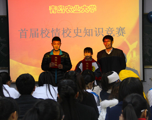 12月13日,青岛农业大学首届校情校史知识竞赛在教学区举行。本次竞赛由学校校友工作办公室主办,校友志愿者协会承办,化学与药学院2013级和2014级各专业共8支代表队参加了比赛。校友工作办公室主任何忠诚、校友工作办公室主任科员于宁、校志愿者联合会主席王忠倩以及化学与药学院社团部部长王欢出席比赛并担任评委。