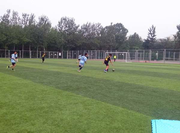 比赛本着“比赛,重在参与”的原则,毕业生代表队由上一届足球队队长张弛带队,学院足球队由李登恢带队,牛庆瑞担任本次比赛裁判。比赛开始,学院毕业生代表队立即发起勇猛的进攻,首发一球,凭借其默契配合,机警的进攻,以3:1的比分锁定上半场。在短暂的休整后,化药足球队应对攻势也不甘示弱,积极调整战术,充分发挥自身实力,学院足球队队员李增金上演了帽子戏法,连进三球,最终以5:5平的比分结束比赛,足球赛自此圆满落下帷幕。整场比赛高潮迭起,各队队员激烈争夺、严密防守,在运球、控球、防守、射门等方面都显示出了娴熟技艺。