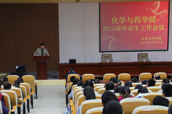 10月17日,化学与药学院2015届毕业生工作会议在学术会馆顺利举行,本次会议主要针对毕业、考研和就业等三大方面的相关毕业生工作进行全面部署,学院院长曲宝涵、副院长吕海涛、辅导员田保玲以及2011级全体毕业生参加了此次会议,会议由田保玲主持。