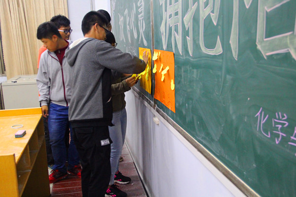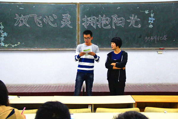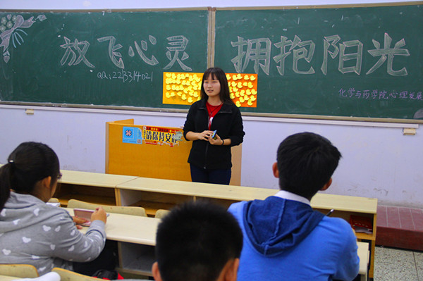 10月18日,化学与药学院在教学区举办主题为“放飞心灵,拥抱阳光”心灵指导手册学习活动。本次活动由心理发展部主办,15级全体学生参与了活动。