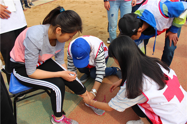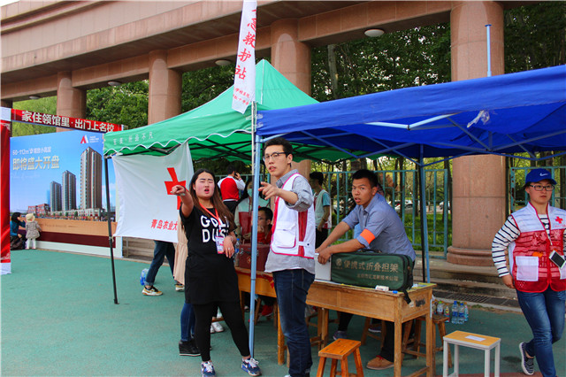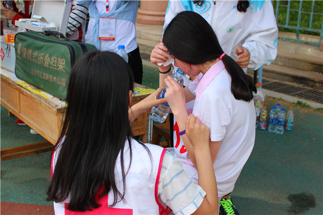 志愿者操场边缘设立紧急救护站,及时接收需救治讯息,并火速赶往救急现场。