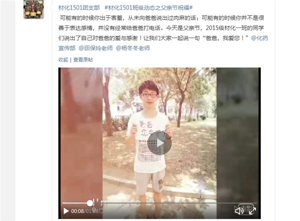 6月19日,正值父亲节,化学与药学院开展“父爱如山,学会感恩”感恩父亲节系列活动。学院学生采取短信、致电、专题晚会、祝福视频等多种形式,表达对父亲的感谢并为父亲送上最诚挚的祝福。