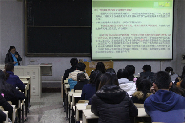 11月9日,化学与药学院在教学区召开2017届毕业生就业指导会,学院团委书记王海霞、正科级辅导员田保玲与会,青岛思达管理顾问有限公司总经理葛斌受邀出席并做指导报告,2017届全体毕业生参加。