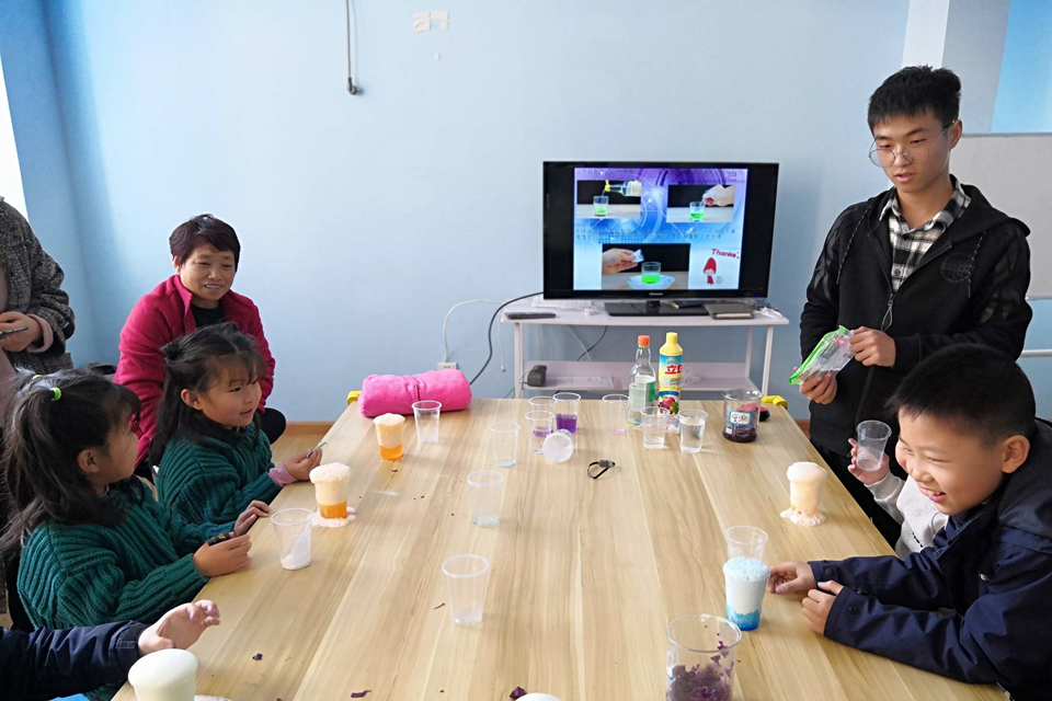 活动中,科普小组成员以做化学小实验的方式向学生们解释生活现象,如紫甘蓝变色实验、“香草奶昔”等趣味实验。