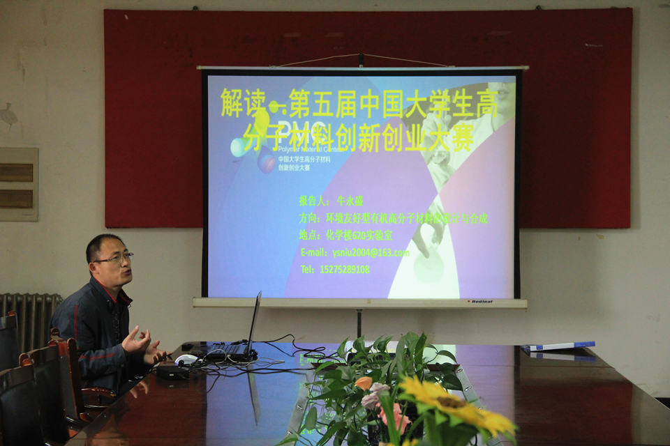 5月5日,化学与药学院于信息楼会议室召开第五届中国大学生高分子创新创业大赛动员会。会议邀请PMC大赛优秀指导教师牛永盛、优秀选手代表封鹏超进行经验交流,创新立项团队全体成员和15级学生参与。议中,牛永盛以PPT的形式就比赛流程、往届回顾、注意事项等方面进行讲解。在回顾往届PMC大赛过程中,牛永盛列举全国各大高校参赛队伍获奖情况及国外选手参赛信息,并指出高新技术的快速发展和交叉型人才的大量涌现使比赛难度逐渐增大的特点。针对团队合作与课题探索等问题,他要求队员之间分工明确,有团队协调意识,申请书注意排版规范,并不断进行修改加工;在答辩时要简明扼要,条理清晰。