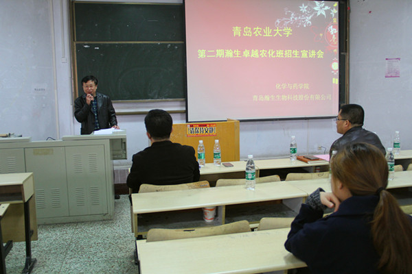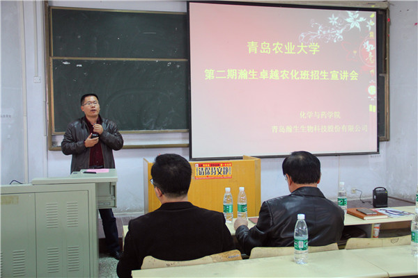 3月5日,第二期“瀚生卓越农化班”招生宣讲会于教学区召开,该农化班由青岛农业大学化学与药学院与青岛瀚生生物科技股份有限公司联合开设。青岛瀚生生物科技股份有限公司副总裁曾宪峰、董事会秘书褚维约、化药学院院长曲宝涵、学院辅导员兼第一期“瀚生卓越农化班”班主任田保玲出席,来自化学与药学院和农学与植物保护学院的12、13级同学参加。会议由褚维约主持。