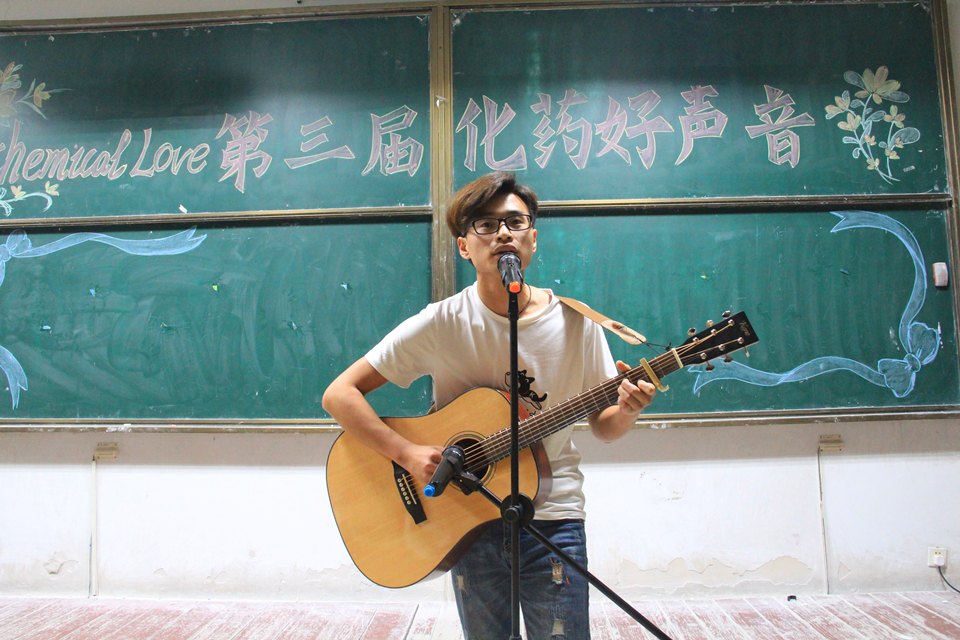 第二轮“黄金话筒”环节中,六位选手依次上台随机抽取演唱曲目,根据歌词进行即兴表演,评选“最佳演绎奖”。其中,制药1602班孙钰洁以一首《王妃》表达人生的勇敢与坚持,令在座的观众深有感触。第三轮“为爱而歌”独唱环节中,每位选手独唱拿手曲目,由评委进行打分,根据总分数角逐出本次比赛的冠亚季军。药学1501班庞赛梦动情演唱《他夏了夏天》:“汗水在他的身上化成了彩虹,步伐的节奏延续生命的河流。”庞赛梦以纯净的声线歌唱出一对知足父母的故事;应用化学1502班范坤以吉他自弹自唱的演奏形式抒发自己对明天的憧憬。最终药学1501班庞赛梦、药学1502班杨景一荣获冠军;应化1502班范坤获得亚军;制药1602班苏子皓获最佳演绎奖。