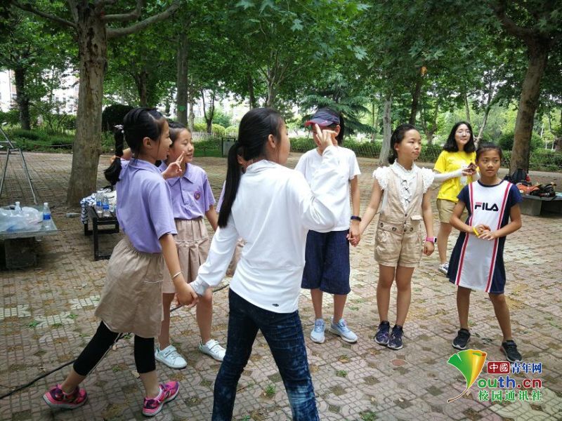 在团体辅导中,小朋友手拉手进行游戏。中国青年网通讯员 李雅雯 摄
