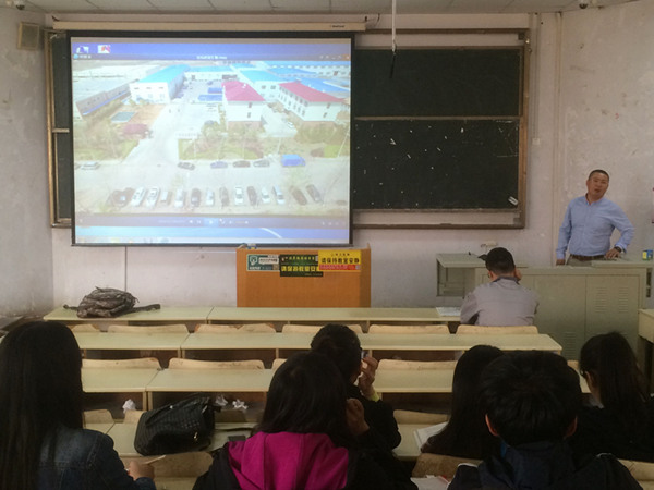 宣讲会尹始,王经理以PPT和视频的形式就公司业务、历史发展、企业文化及所需人才等方面对公司进行详细介绍。王经理介绍,公司业务主要包括印染助剂和水处理助剂两项,印染助剂外贸地域涵盖山东,江苏,内蒙古,河北等地,而水处理助剂已出口至非洲、欧美、美国几家大型公司。