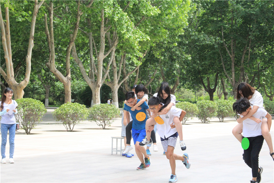 “速度与激情”游戏中,男生背女生奔跑二十米,制药专业一马当先,最先到达终点。
