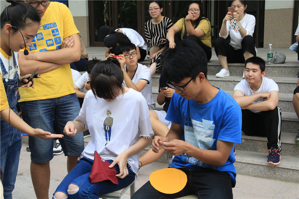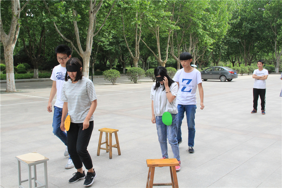 在“你是我的眼”游戏环节,女生蒙眼原地转5圈,然后听从男生指挥跨越板凳障碍,各专业男女组合默契配合,顺利完成任务。
