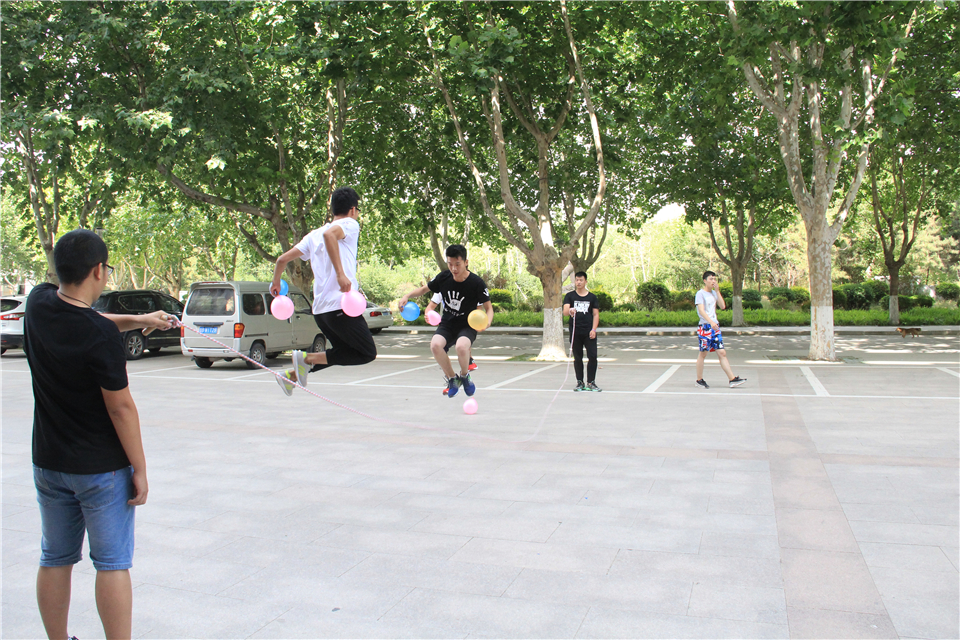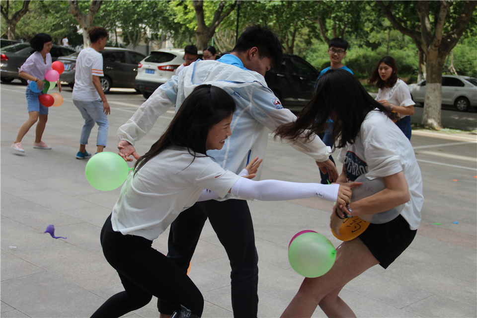 “皮皮虾,我们走”游戏中,由各专业女生吹气球,男生穿越大绳障碍并将气球运至50米外的终点刺破,规定时间内,刺破气球数量最多的获得胜利。各专业男女搭配、争分夺秒完成比赛。