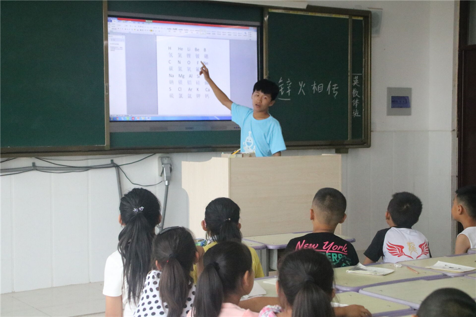 实验课结束后,队员们希望能提前帮助孩子们了解化学知识,而不是仅仅通过实验引起他们对化学的兴趣,于是队员们决定下午临时给孩子们增加一门化学入门课—元素周期表基础教学。