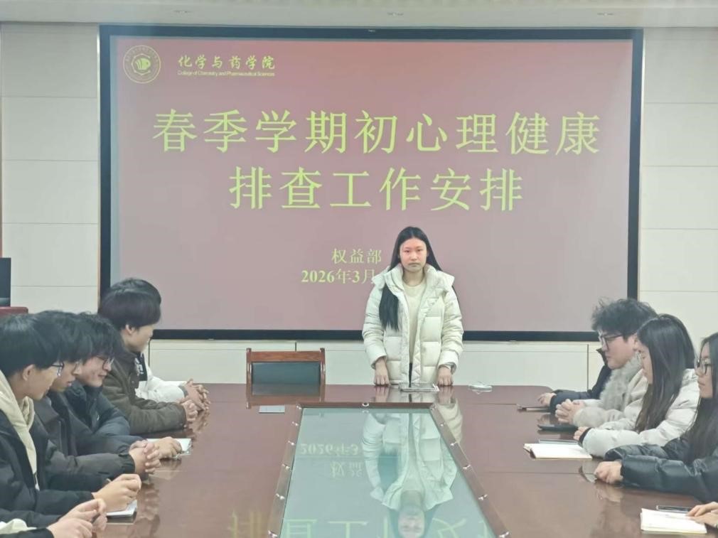 为筑牢春季学期校园心理健康防线,精准掌握学生返校后心理动态,扎实推进心理健康教育与危机干预工作,3月10日,化学与药学院于化学楼会议室召开春季学期心理健康排查工作部署会。会议由正科级辅导员江守林主持,权益部全体成员参会。