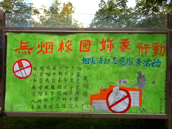 为响应校学工部(处)《关于在全校学生中禁止吸烟的实施意见》文件的精神,化学与药学院师生齐心协力、全方位展开禁烟工作,倡导学生“珍爱生命,远离烟草”理念,共创无烟环境,力建文明校园。