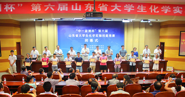 山东省大学生化学实验技能竞赛组委会主任、山东大学本科生院副院长、山东大学教师发展中心主任张树永教授宣读了第六届大学生实验技能竞赛获奖学生名单。一等奖分别由中国石油大学王晖、中国海洋大学张文倩等22名同学获得;二等奖分别由中国石油大学韩鹏、烟台大学王艺等32名同学获得;三等奖分别由滨州学院杨梅、德州学院李丹等44名同学获得。青岛农业大学作为承办方不参与一二三等奖的评选,张文文等6名同学获得优胜奖。主席台嘉宾分别为获奖学生颁奖并表示祝贺。