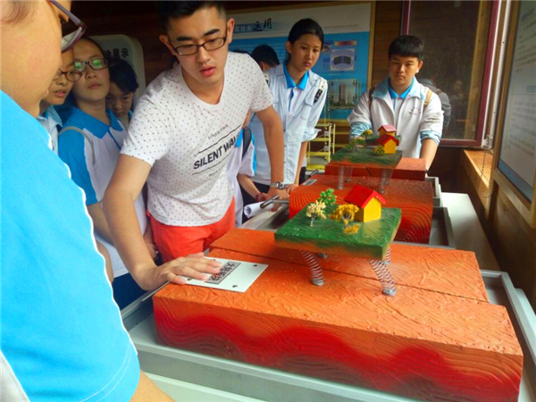 刘先聪以自我介绍开始宣讲,采用讲解、视频、模拟实践以及亲身体验的方式,让孩子们直观深入的感受地震,学习地震的相关知识及自救互救常识。他细致地讲解每块展板的内容,并用德国科学家阿尔弗列德魏格纳发现大陆漂移说的故事吸引参观学生兴趣。“同学们要好好学习,发现生活中的细节,就有可能成为像魏格纳一样的名人。”刘先聪号召道。