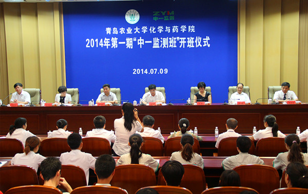 7月9日,青岛农业大学化学与药学院2014年第一期“中一监测班”开班仪式在文经楼第一报告厅隆重举行。青岛农业大学副校长杨同毅、教务处处长朱连勤、青岛市分析测试学会秘书长、中科院海洋研究所博士生导师王琦、青岛中一监测有限公司董事长张凯钟以及青岛中一监测有限公司员工代表、首期“中一监测班”学员参加开班仪式,化学与药学院院长曲宝涵主持仪式。