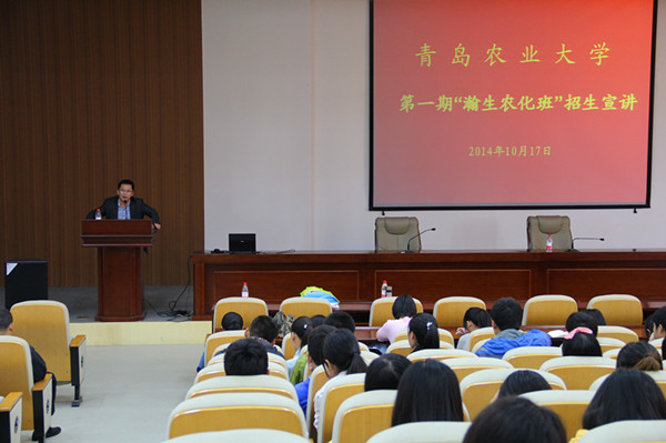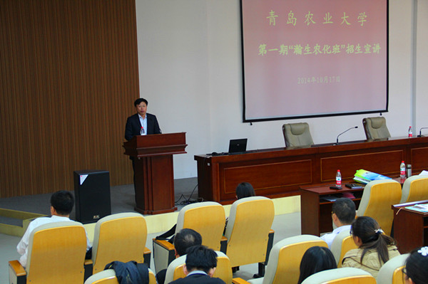 褚维约为“瀚生农化班”作宣讲报告。他详细的介绍了“瀚生农化班”的培养方案及课程设置。褚维约指出,“瀚生农化班”的培养分为招生宣讲,集中理论培训、实习培养,选择就业四个阶段,理论培训实行小班制统一授课,培训内容包含农化行业现状、农化行业基本知识、农药发展研发生产知识、农化营销知识、农化营销流程与技巧及大学生就业职业规划等,面向制药工程、应用化学、植物保护、农学、药学、化学工程与工艺等相关专业的学生进行招生。同时,褚维约强调,大学期间要注重个人职业生涯规划,注重培养独立、自主和适应社会的能力,提高自身的就业竞争力。他说,“瀚生农化班”是一个舞台,同学们在这个舞台可以提前获得社会行业经验,毕业后可以马上进入企业工作,既能全面掌握农化行业的发展前程,拥有青岛农业大学与瀚生生物科技股份有限公司共同颁发的结业证书,又能提高自身就业竞争力,增加就业砝码。
