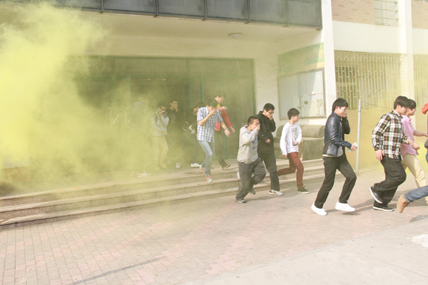 演练开始后,保卫处人员在宿舍楼门口点燃烟雾弹并拉响警报,营造了宿舍火灾氛围,警报响起后,全体同学正式撤离宿舍,到达空旷场地,按照班级有序地站好队,集合完毕后,丁鲁江从消防安全知识和面对火灾入手,分析了火灾发生时常见的问题。他指出,当身临火灾现场时,人容易惊慌失措,这种心理,常会造成更加严重的人员伤亡和财产损失,要克服这种心理,就要保持清醒头脑,做出正确判断,认真思考做出正确决定,积极扑救初期火灾。随后,丁鲁江用“拔鞘子,握管子,压把子”九个字总结了干粉灭火器的使用方法。 除宿舍安全逃生外,此次演练还安排了灭火器的实战训练。保卫科工作人员准备好灭火器,点燃了木材,同学们按照灭火器使用方法进行了实战练习,灭火过程迅速有序。