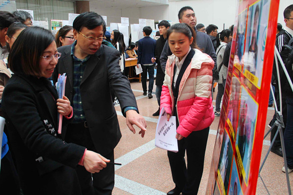 招聘会中,学院领导老师莅临现场,对毕业生进行就业指导。药学专业王赛对学院正科级辅导员田保玲说:“我想找一个研发类的岗位,但企业对这类岗位的要求都是研究生以上学历,这让我很苦恼。”“不要一味地看公司需要什么样的人才,找到合适的公司后要学会自己推荐自己,多做准备才能抓住机会。”田保玲说道。