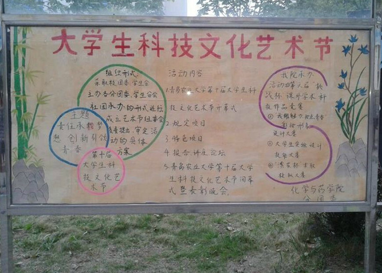 通过本次展板宣传,使化药的同学们了解到大学生科技文化艺术节的相关内容,为我院主办活动的顺利进行做好铺垫,同时也为大学生科技文化艺术节的圆满举行打下基础。