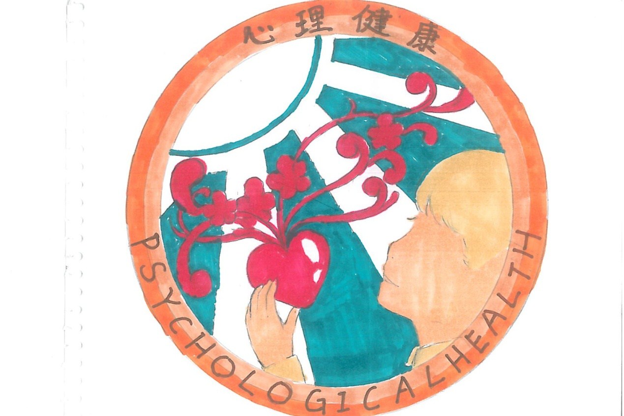 制药1601班江紫玮以“面朝朝阳,心花盛开”为主题,将阳光、孩童、红心等元素融入到作品中,图中孩童在阳光下手捧盛开着花朵的的红心寓意开朗活泼、朝气蓬勃的心理状态。
