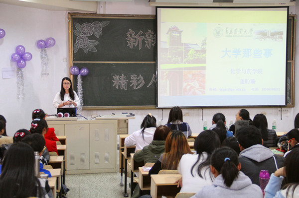 10月31日,化学与药学院于教学区召开新新女子大学堂讲座,本次讲座由学院女生部主办,邀请了学院教师盖盼盼、许洁做讲师,女生部干事王宇担任主持,学院共300余名学生参加。