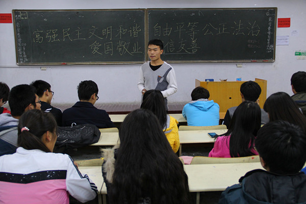 韩凯就“友善”这一话题,围绕与同学友善、与家人友善、与老师友善三个方面进行了深刻的讲解。他说:“友善是待人心平气和,谦虚有礼,是在父母需要你时多回家陪陪他们,是在别人遇到困难时你伸出一只手,是对陌生人的一个微笑。”从反面事例“马加爵事件”中,韩凯讲道:“宿舍舍友之间应该学会换位思考,互相关心,互相尊重,积极营造一个温馨和谐的宿舍氛围。”