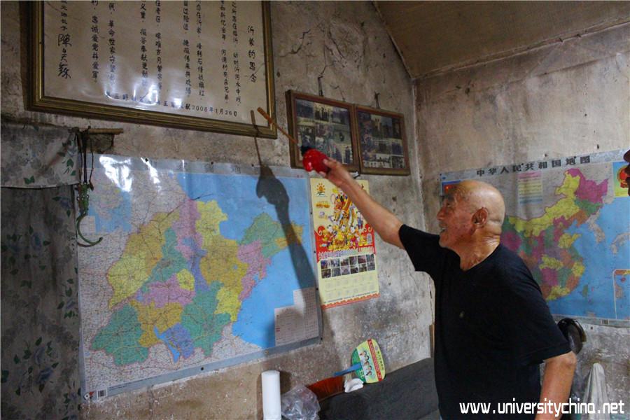 随后实践队来到了钟恩章老人的家,老人今年83岁了,至今已和钟老妇人已经在在这个房子里生活了60多年了。1946年春,新四军挺进沂蒙,军部设在沂河东岸前河湾村的一片密林中。陈毅一家就住在钟恩章家。钟恩章老人记得,那是暮春的一个傍晚,一辆老式轿车搬来陈毅一家人。从此两家人亲如一家,同在一个屋檐下,吃饭,聊天,孩子们在一起玩耍。前后不到一年,新四军就撤离了。