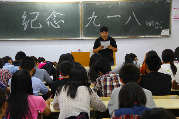 各班级在政治学习前,事先收集了相关学习材料,然后各新生班级在班级助理、临时负责人的带领下认真学习了相关材料。2014级药学专业在班级临时负责人王飞的带领下,分别从“血的历史,昨日国耻,今朝邦兴”三个方面学习了九一八事件的材料,回顾了九一八事变以来中国从被侵略,到抗争,再到崛起的复兴之路,在全体同学中树立了:“伟大的祖国历经磨难,而广大学生肩负着跨世纪的历史使命,青年学生不甘心落后于前人,要继承和发扬先行者们留给我们的不怕困难,开拓进取的大无畏精神”的理念氛围。